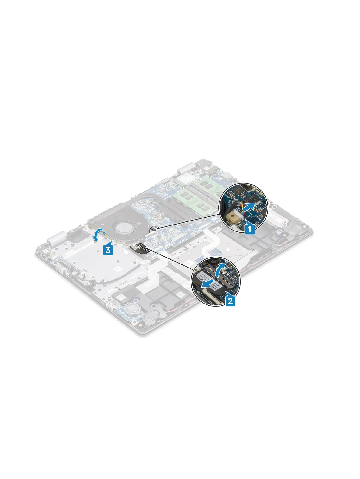 1 Disconnect the fan cable and display cable from the system board [1, 2].