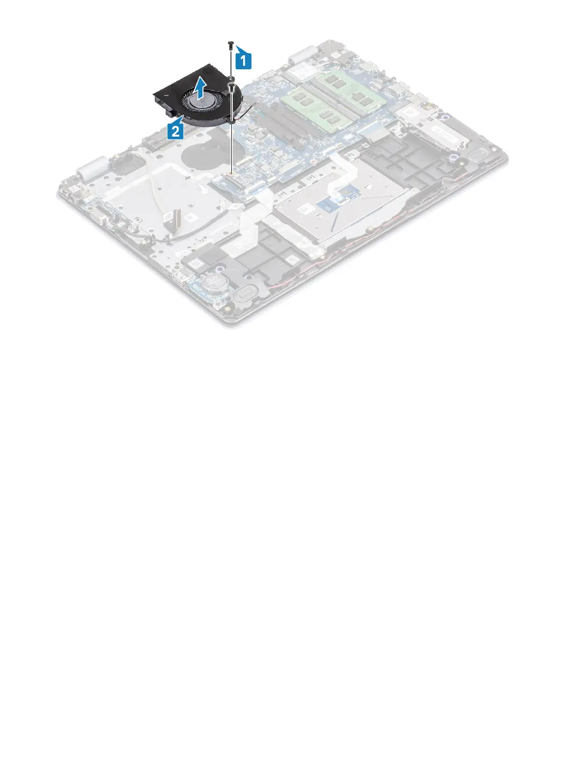 2 Replace the two (M2x5) screws that secure the fan to the palm rest and keyboard board assembly [2].