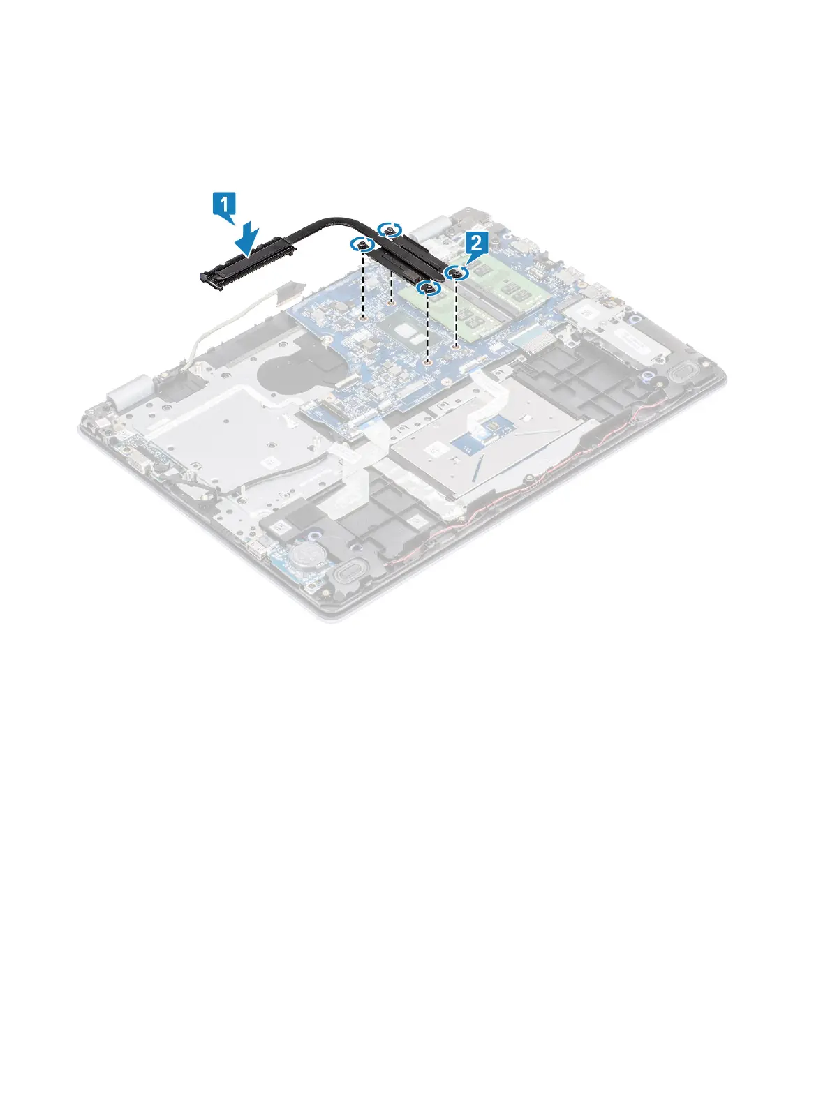 2 In sequential order (as indicated on the heatsink), tighten the four captive screws that secure the heatsink to the system board [2].