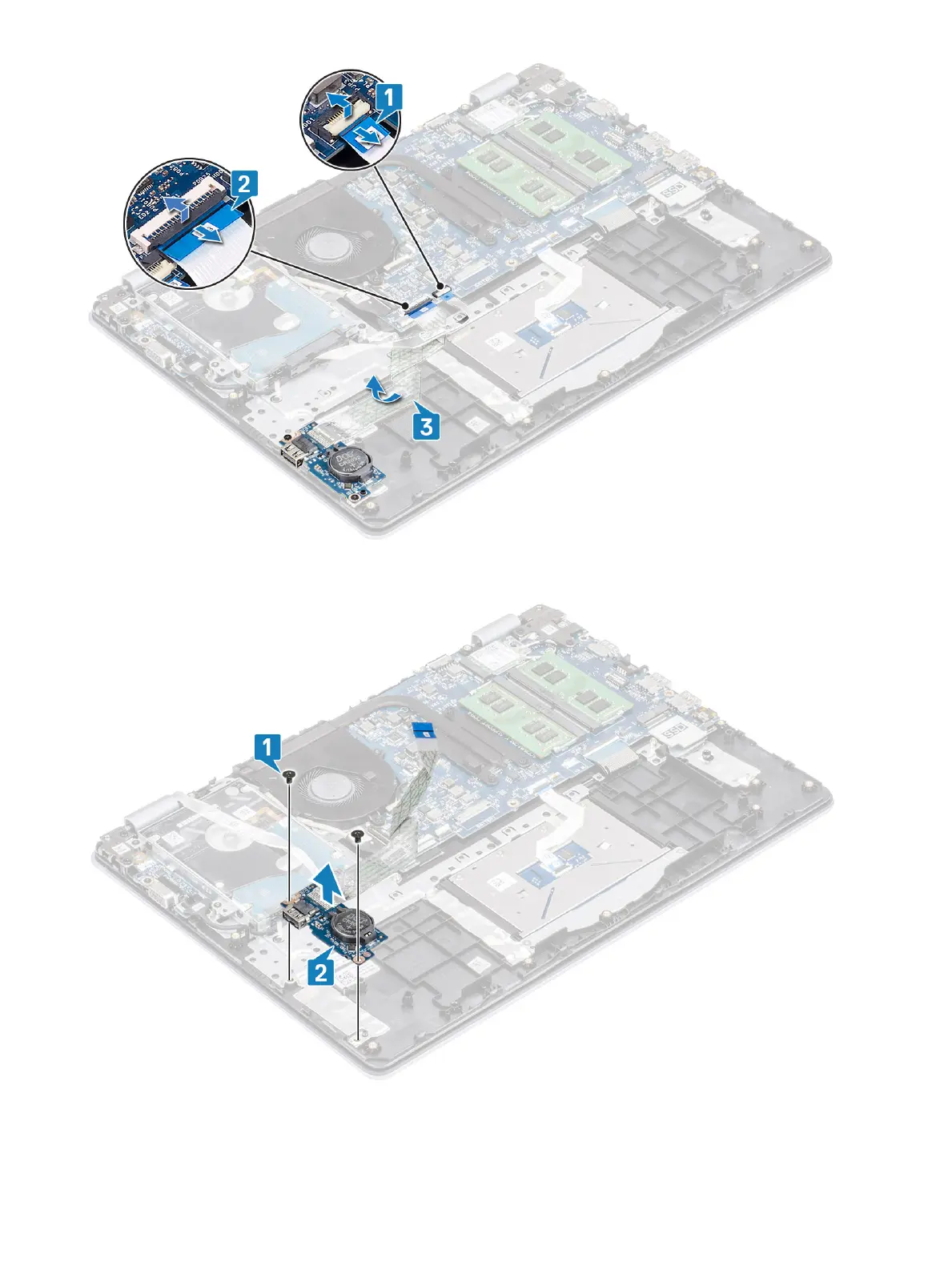 4 Remove the two (M2x4) screws that secure the I/O board to the palm rest and keyboard assembly [1].