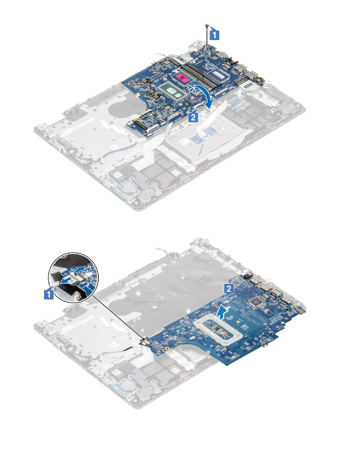 5 Lift the system board o the palm-rest and keyboard assembly [2].