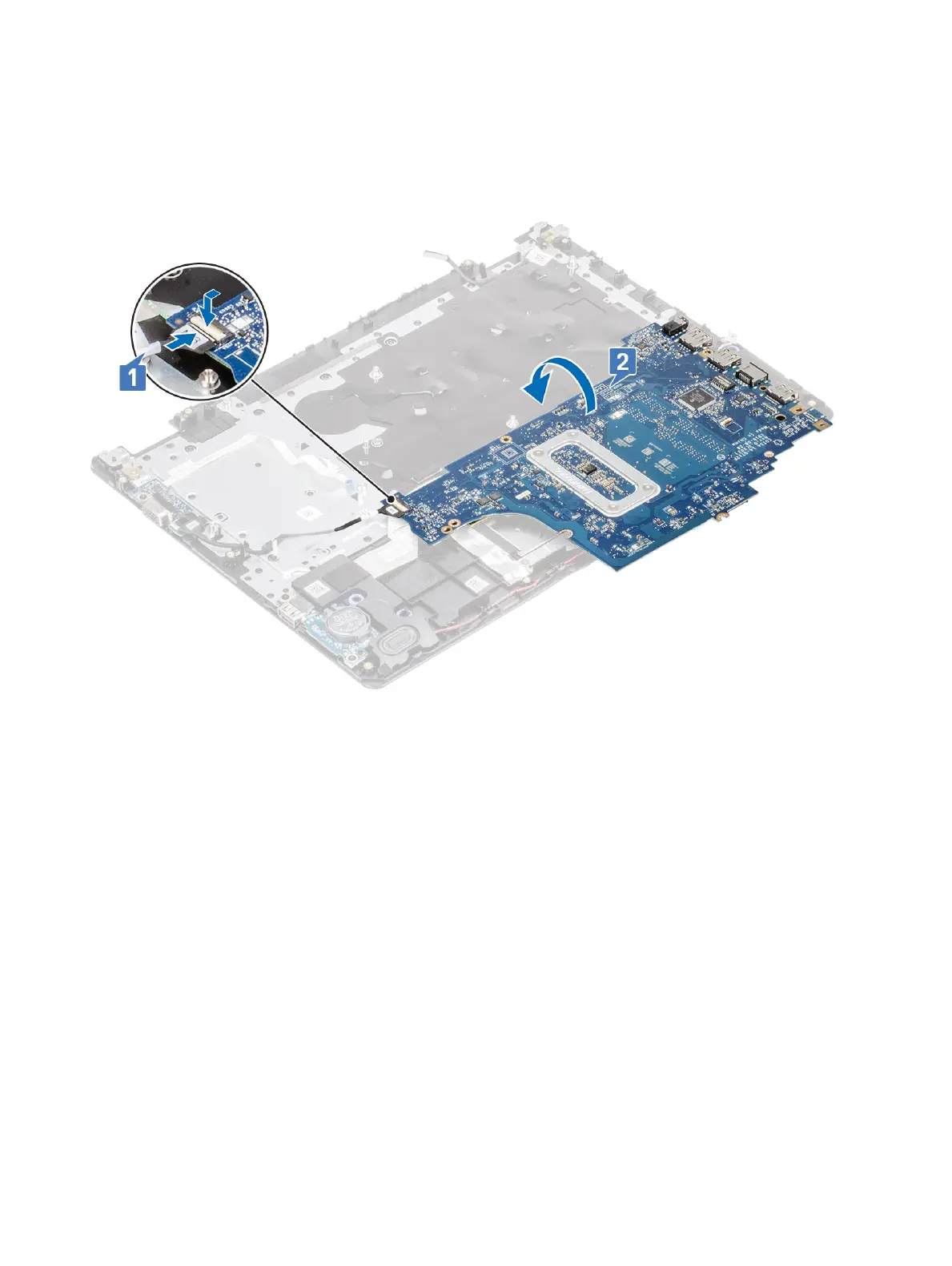 2 Flip and place the system board on the palmrest and keyboard assembly [2].