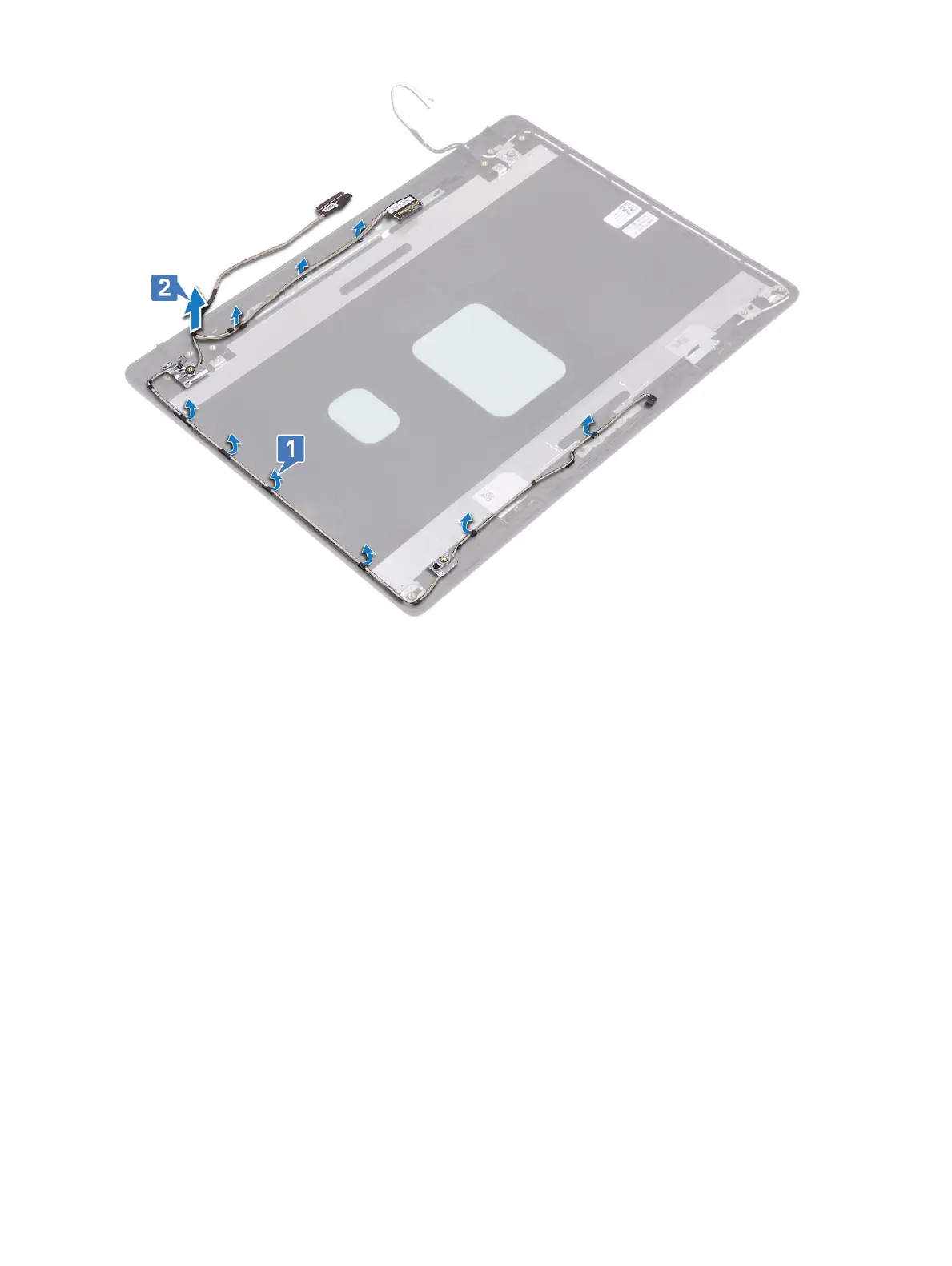 1 Place the display cable and camera cable on the display back-cover and antenna assembly [1].