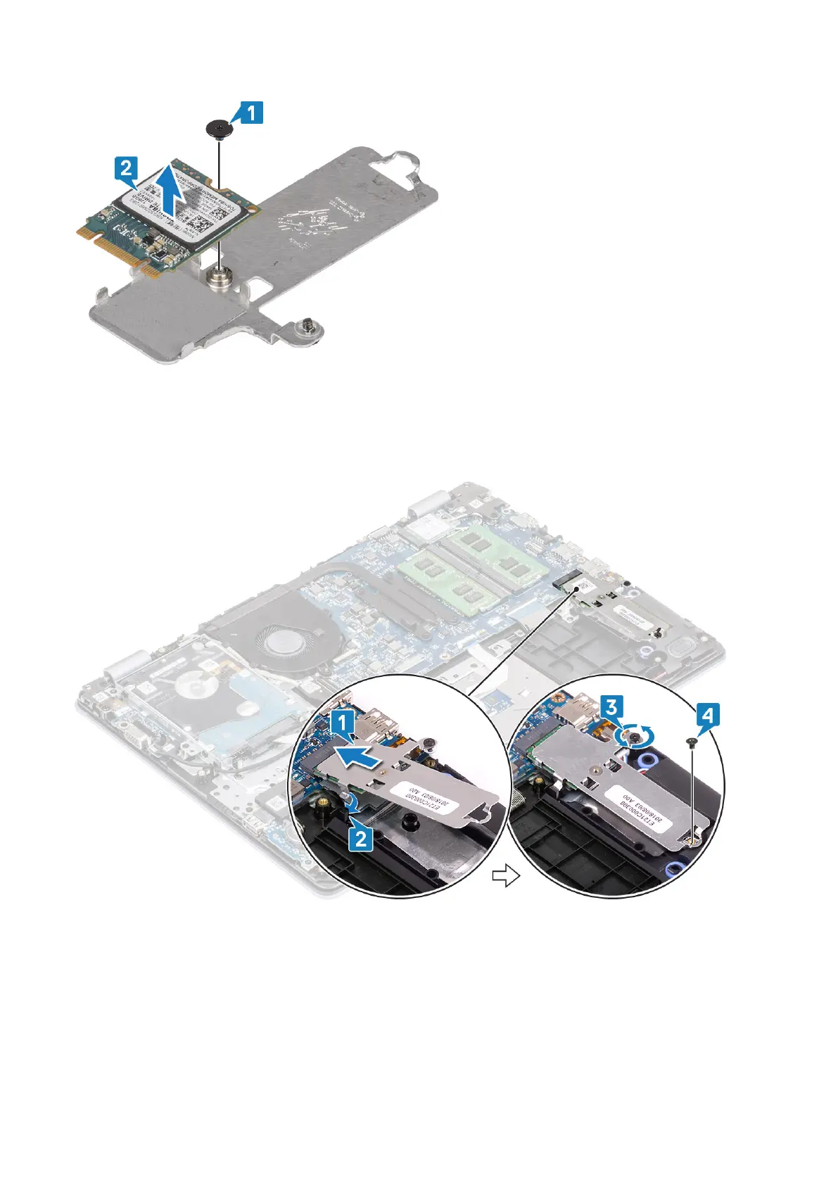 4. Slide and insert the tab of the solid-state drive into the solid-state drive slot [1, 2].