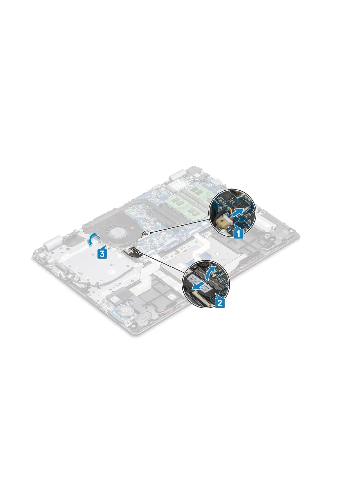 1. Disconnect the display cable and fan cable from the system board [1, 2].