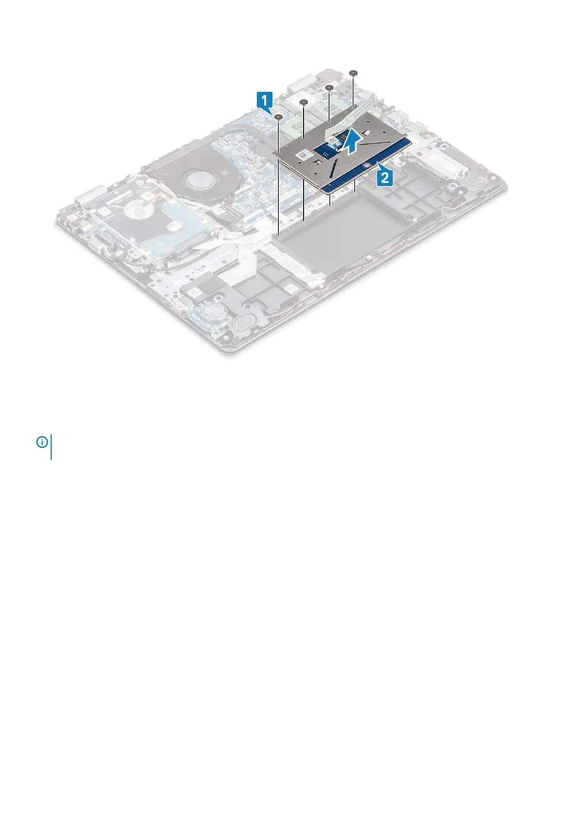 2. Replace the four (M2x2) screws that secure the touch pad to the palmrest and keyboard assembly [2].