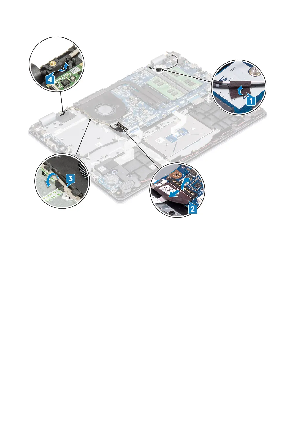 4. Remove the four (M2.5x6) screws that secure the left and right hinges to the system board, and palmrest and keyboard assembly.