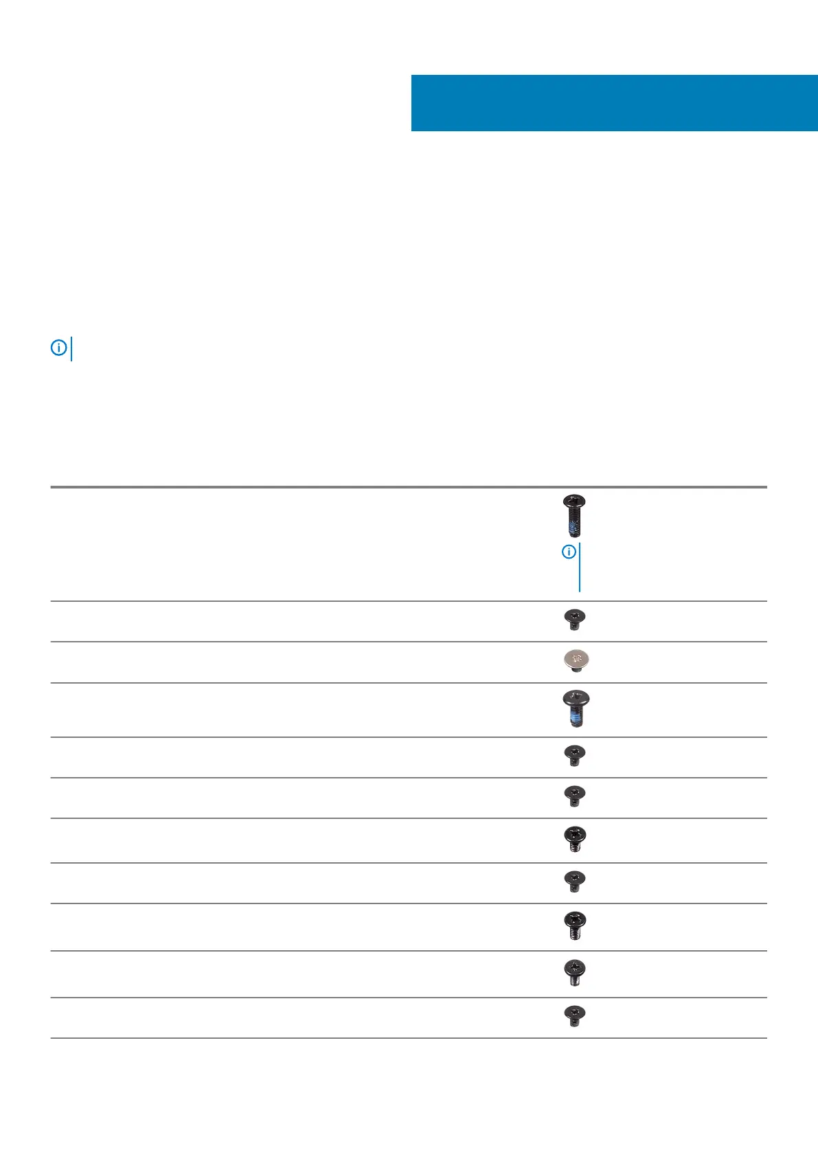 The table provides the list of screws that are used for securing different components.