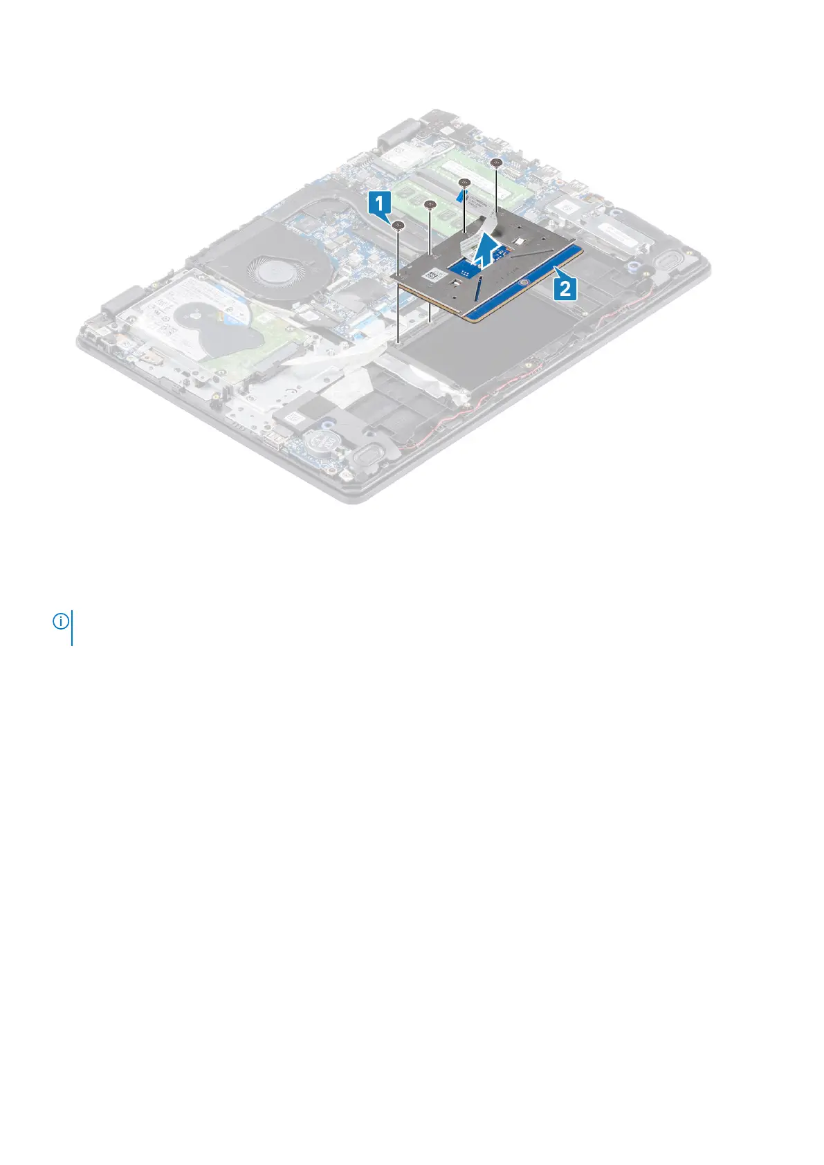 2. Replace the four (M2x2) screws that secure the touch pad to the palmrest and keyboard assembly [2].