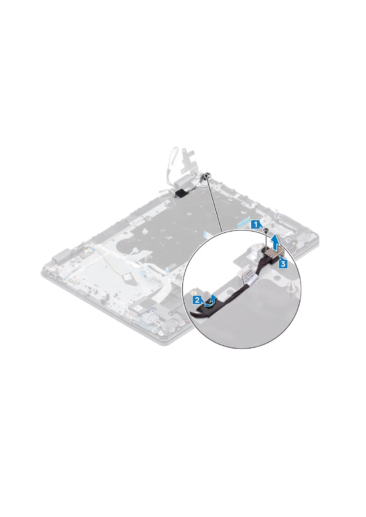 1. Remove the single (M2x3) screw that secures the power adapter port to the palmrest and keyboard assembly [1].
