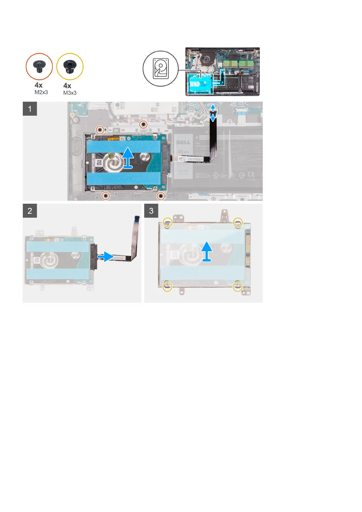 2. Remove the four screws (M2x3) that secure the hard drive assembly to the palmrest and keyboard assembly.