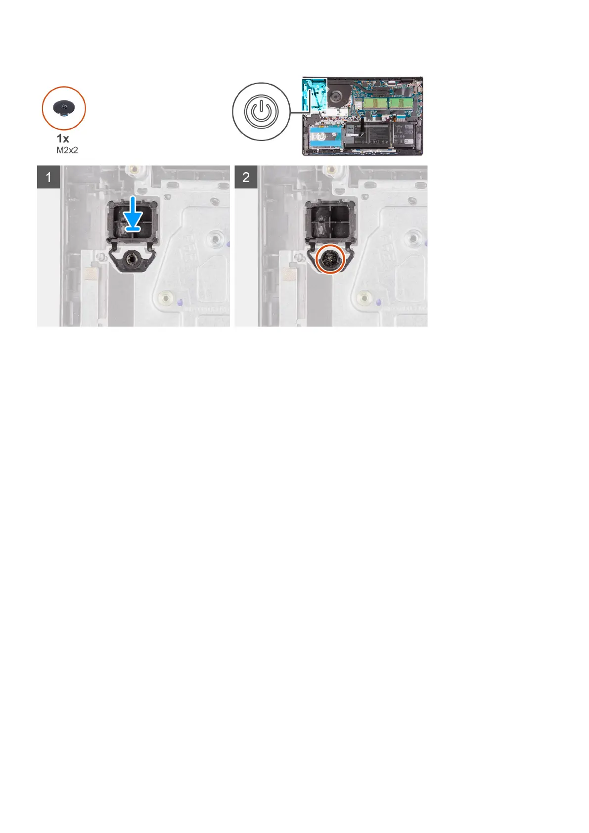 2. Install the single (M2x2) screws to secure the power button to the palm-rest and keyboard assembly.