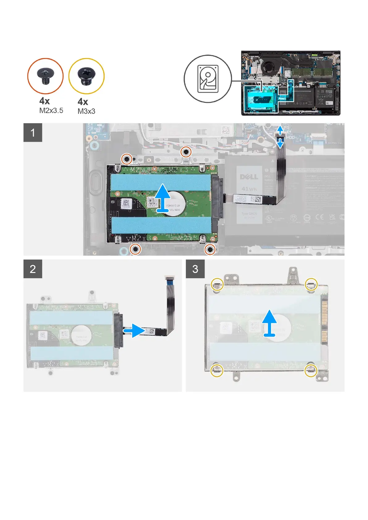 5. Remove the four (M3x3) screws that secure the hard drive to the hard drive bracket.