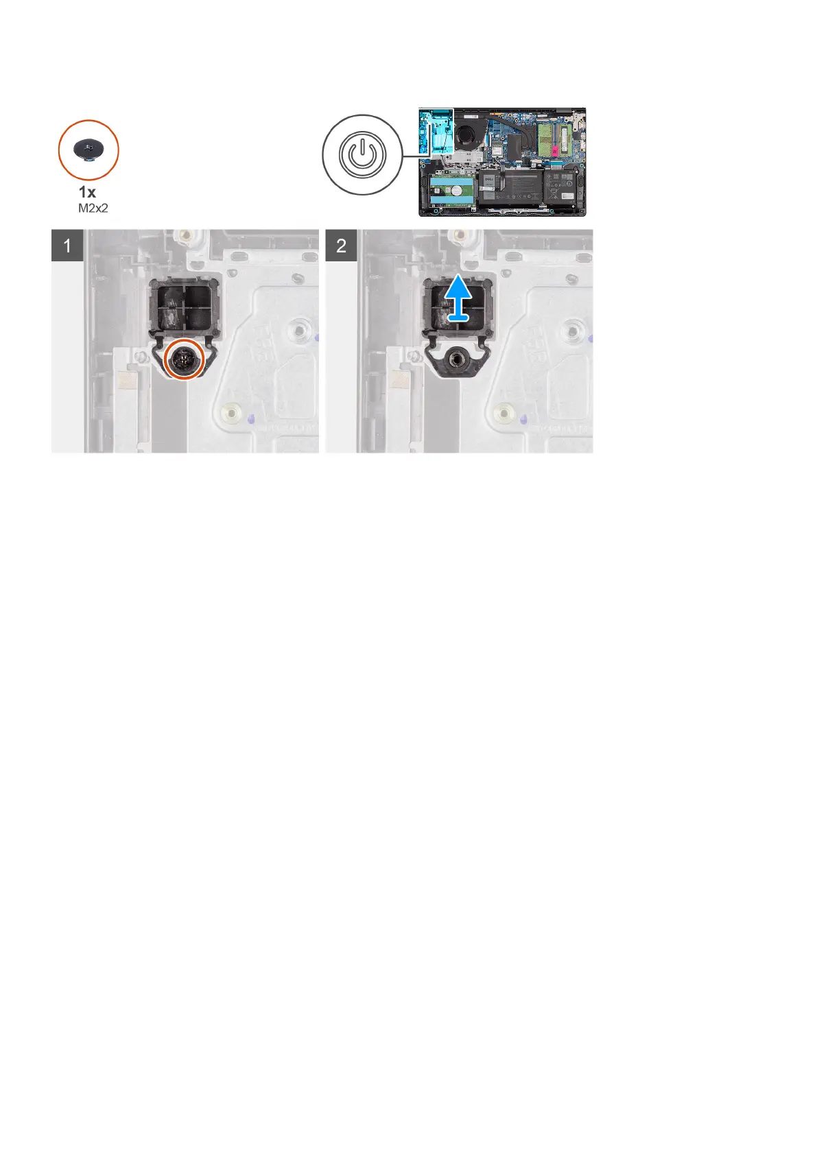 2. Install the single (M2x2) screw to secure the power button to the palm-rest and keyboard assembly.