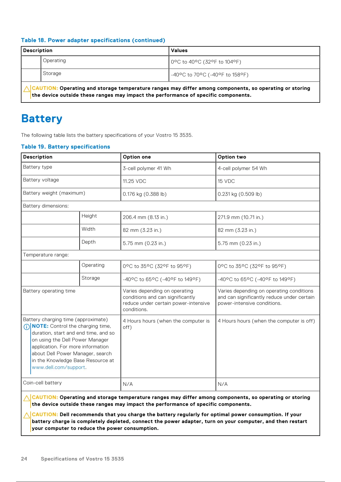 Table 19. Battery specifications