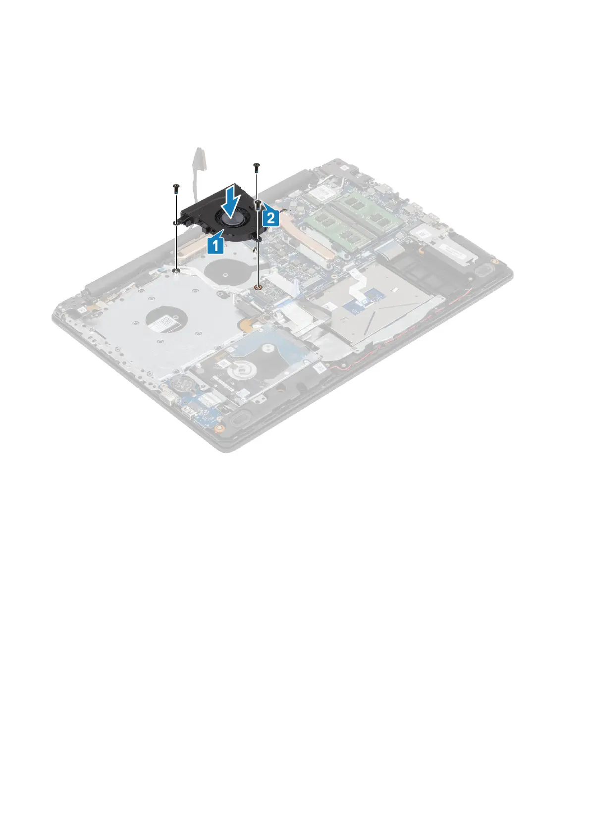 2. Replace the three (M2.5x5) screws that secure the fan to the palm rest and keyboard board assembly [2].