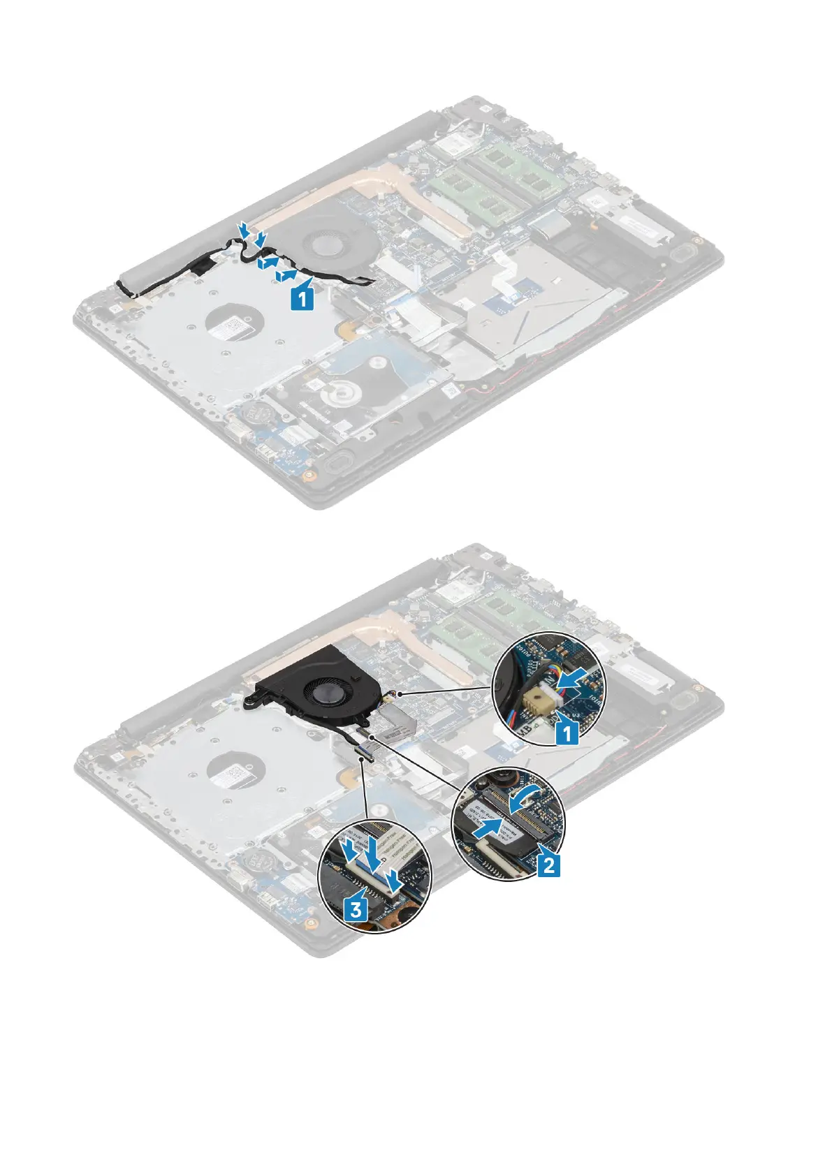 4. Connect the ODD cable, display cable and fan cable to the system board [3,2,1].