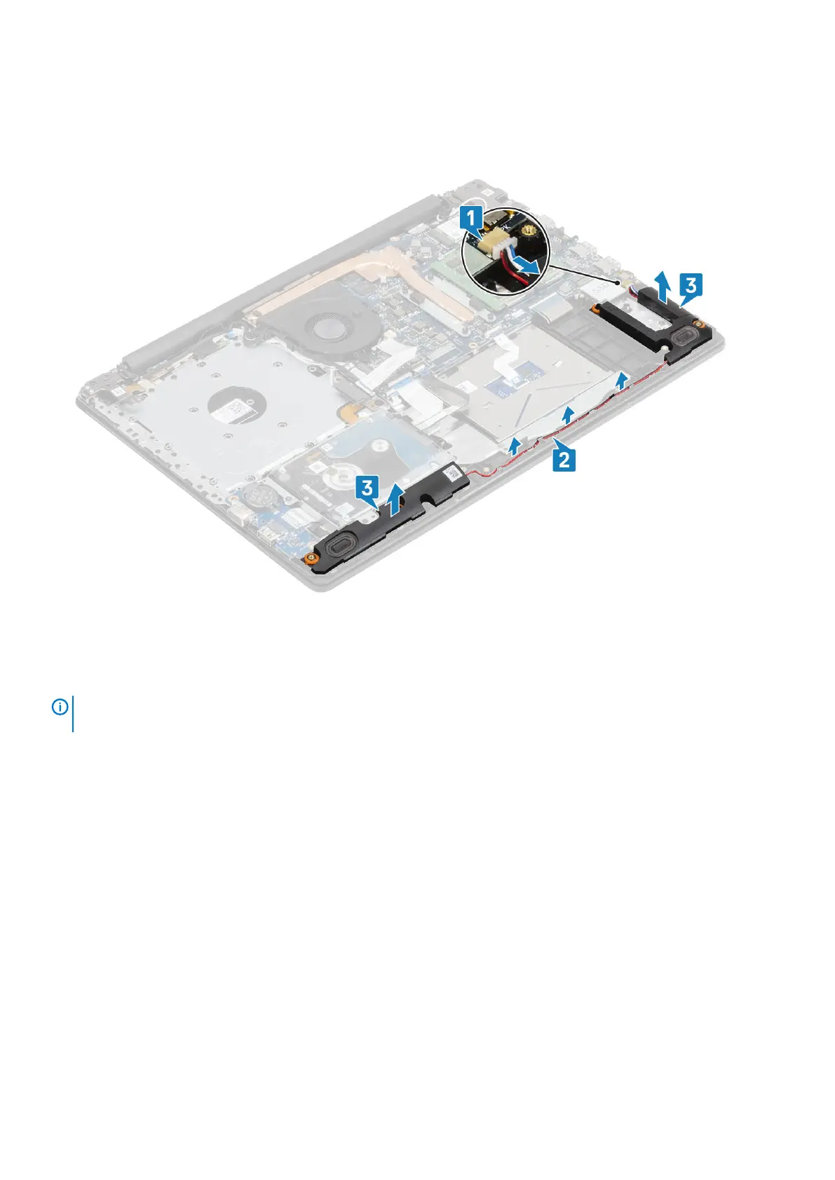 2. Unroute and remove the speaker cable from the routing guides on palm rest and keyboard assembly [2].