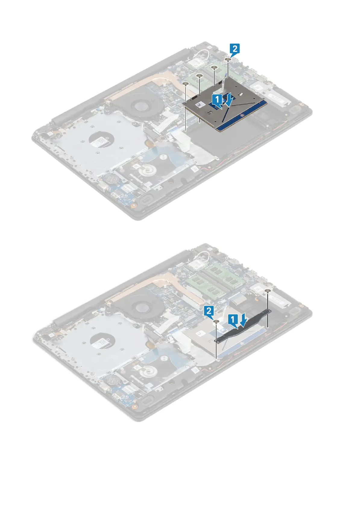 4. Replace the two screws (M2x2) that secure the touch pad bracket to the palmrest and keyboard assembly [2].