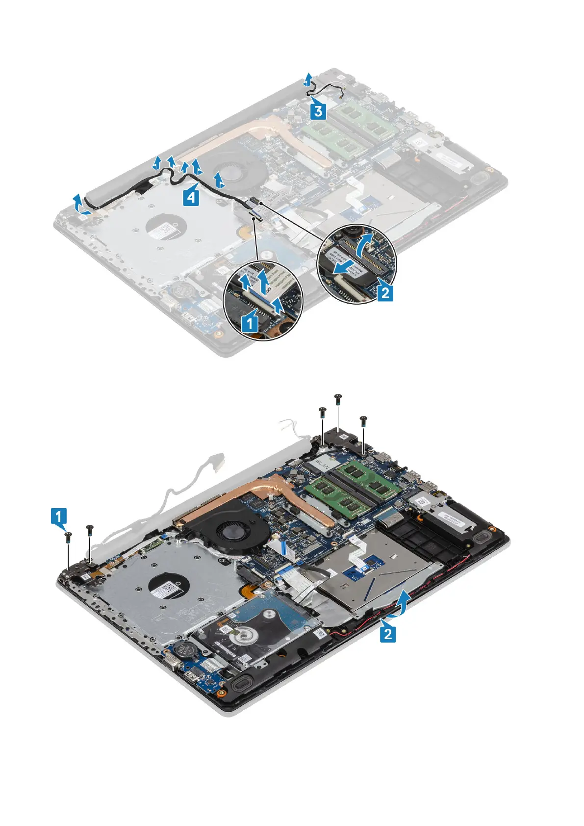 6. Lift the hinges. Remove the palmrest and keyboard assembly off the display assembly [1, 2]