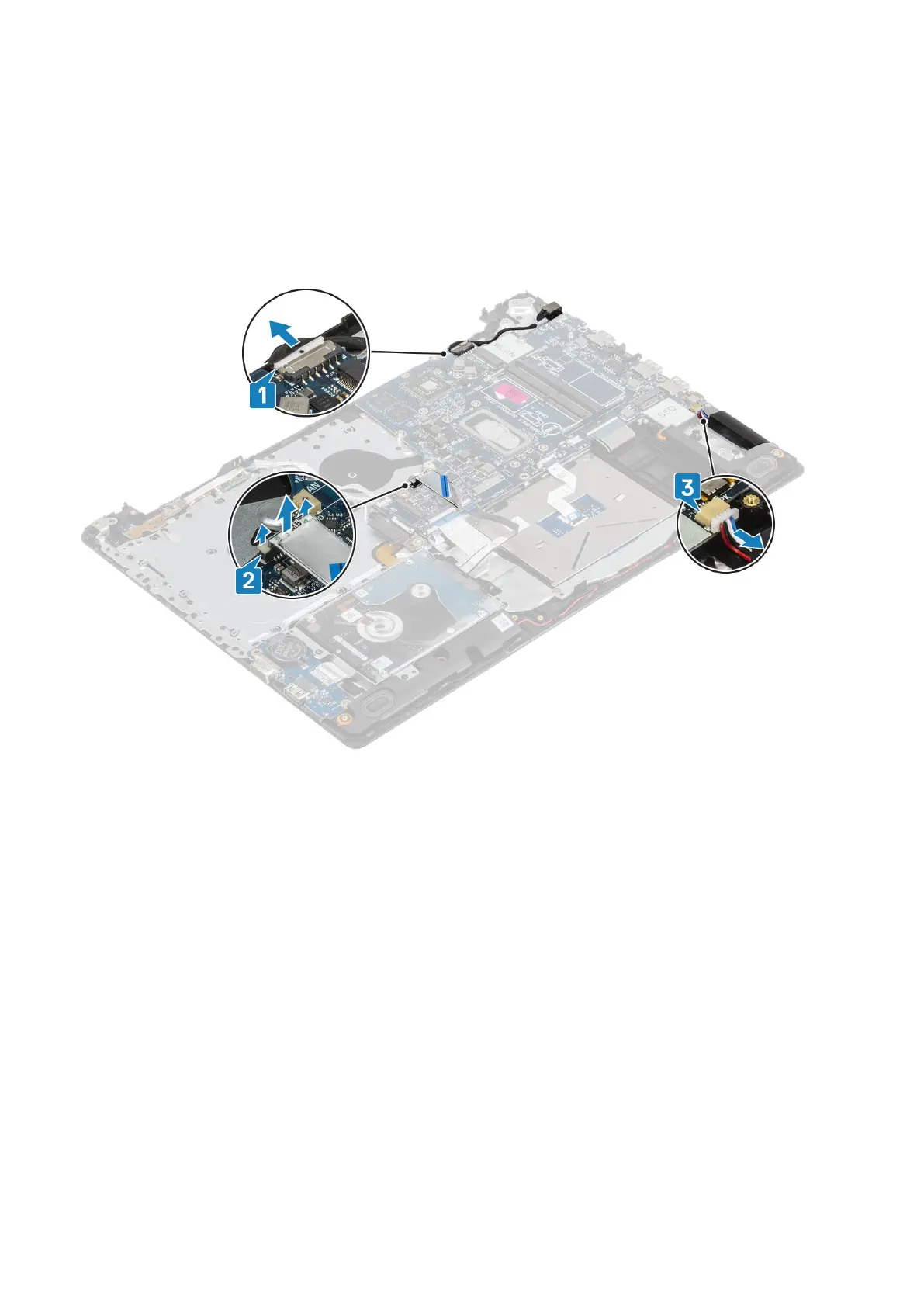 1. Disconnect the power adapter port cable, optical drive cable and speaker cable from the system board [1, 2, 3].