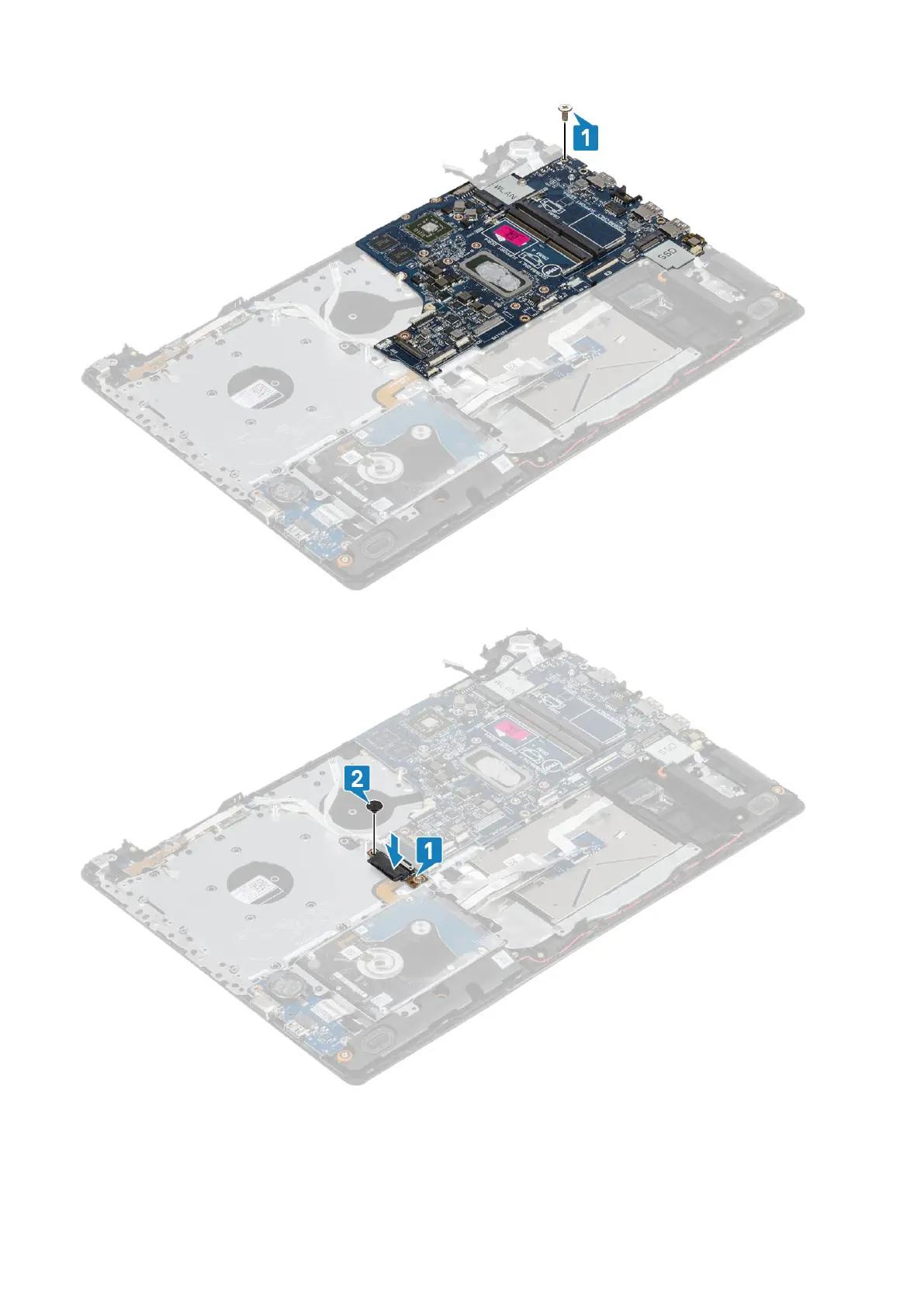 6. Place the optical drive connector and replace the single (M2x2) screw that secures it to the system board [1, 2].