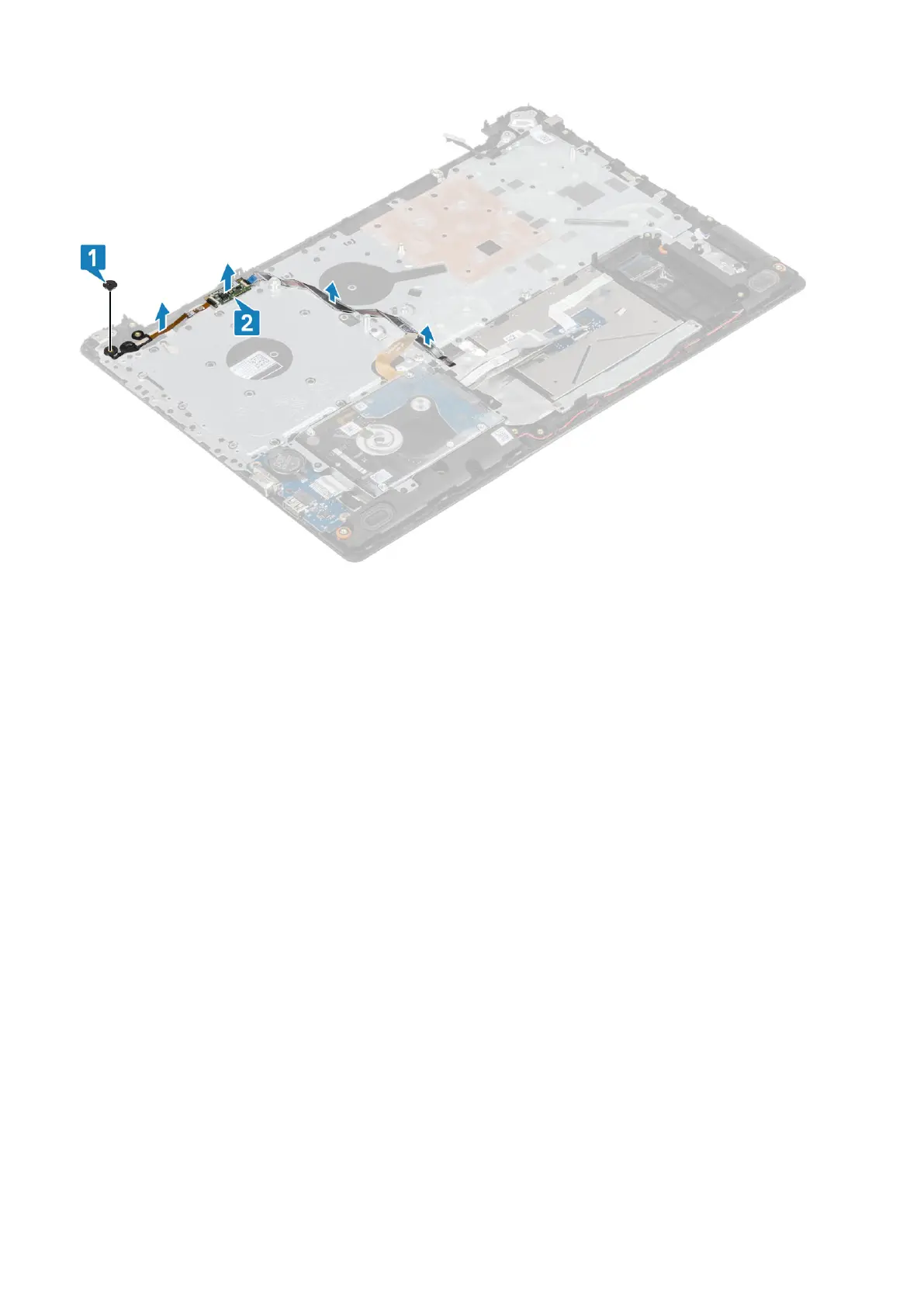 3. Replace the single (M2x2) screw that secures the power button on the palmrest and keyboard assembly [2].