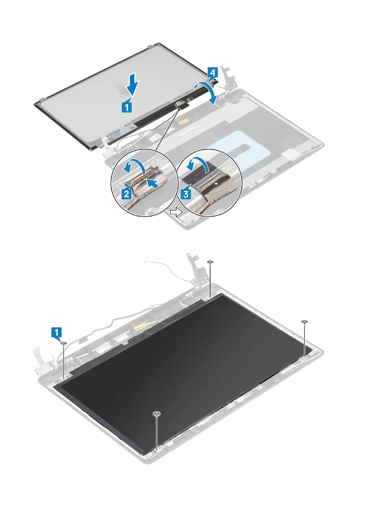 6. Replace the four (M2x2) screws that secure the display panel to the display back-cover and antenna assembly [1].