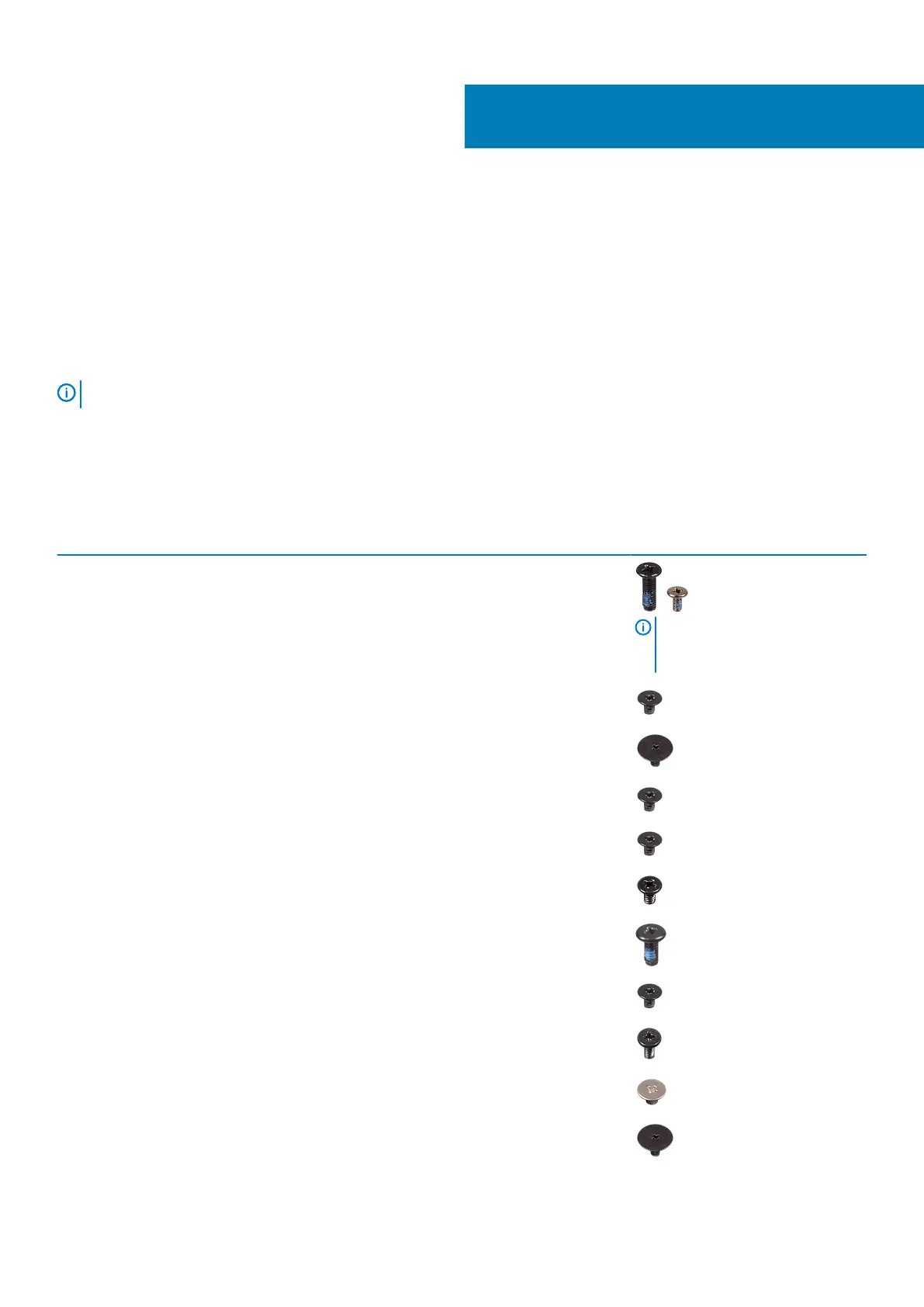 The table provides the list of screws that are used for securing different components.