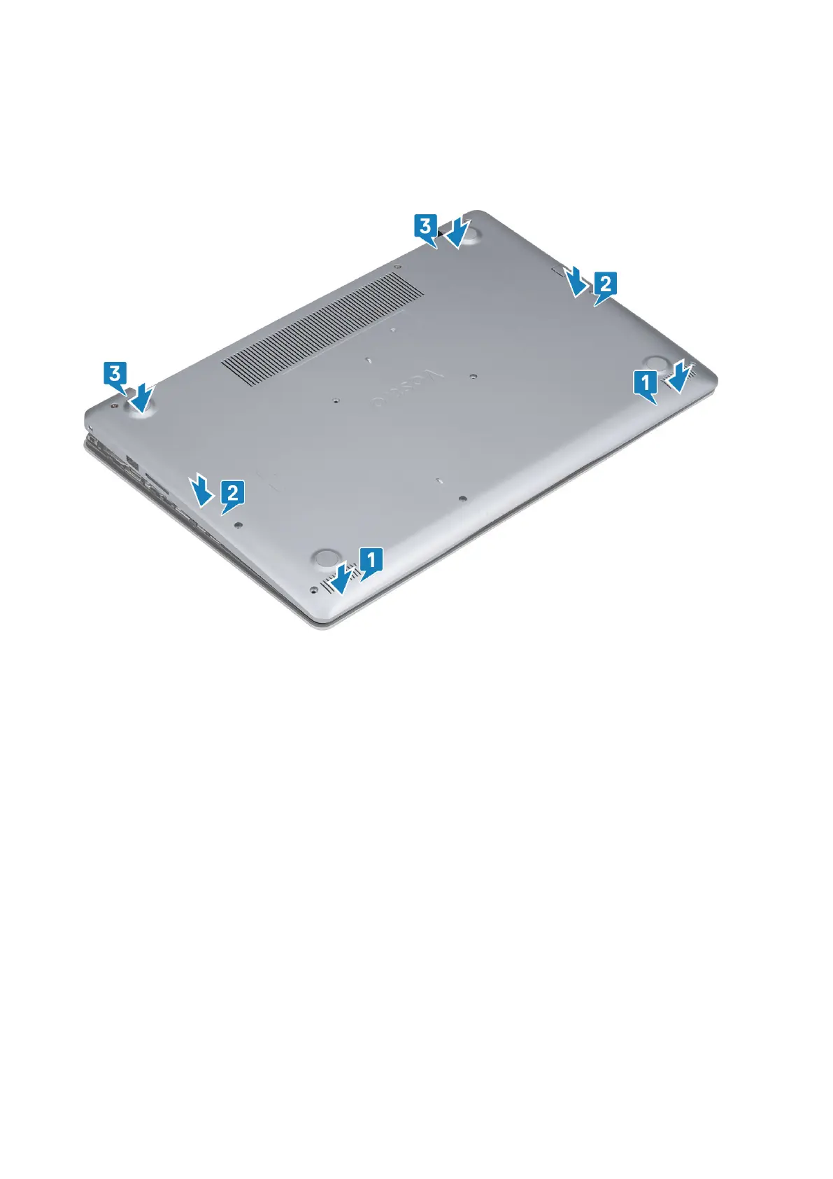 4. Replace the six (M2.5x7) screws that secure the base cover to the palmrest and keyboard assembly [3].
