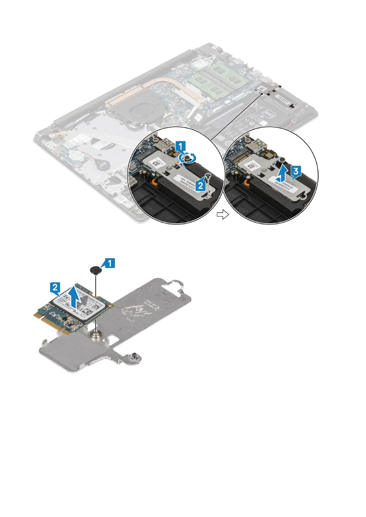 5. Remove the single (M2x2) screw that secures the solid-state drive to the thermal plate [1].