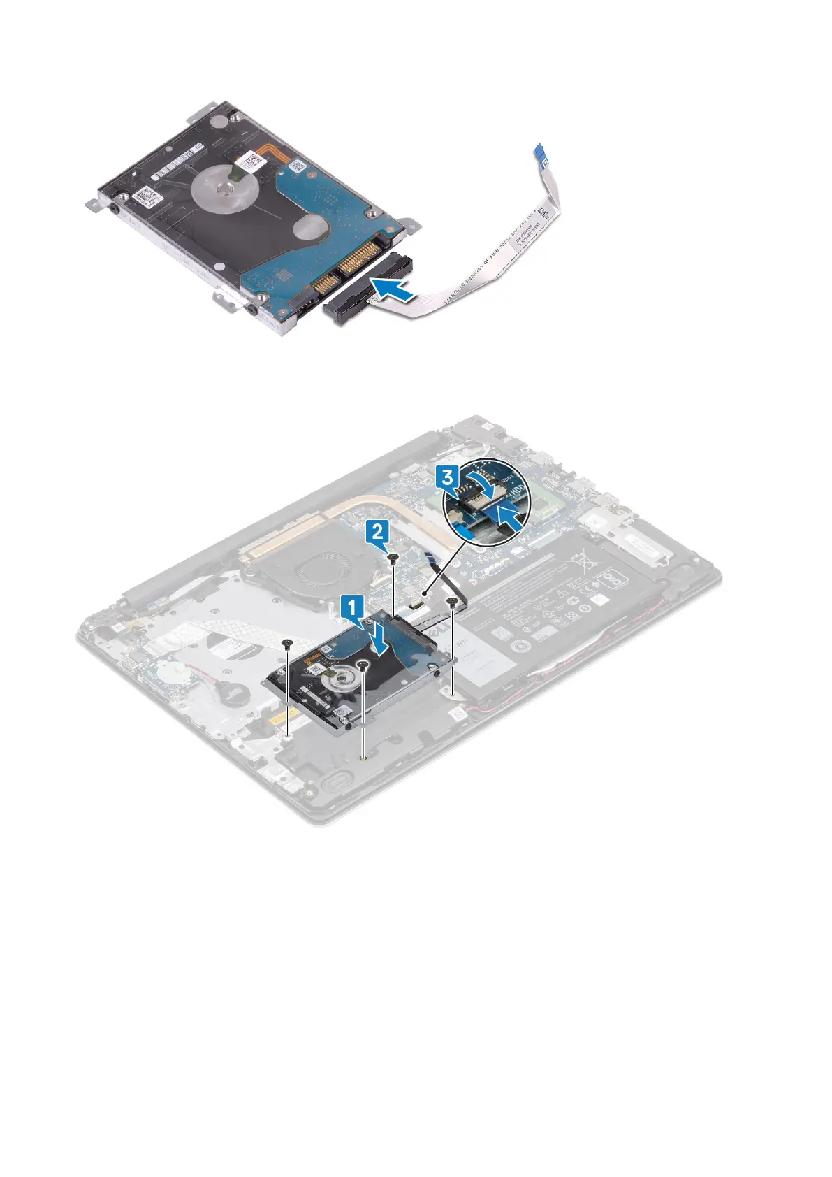 6. Connect the hard drive cable to the system board and close the latch to secure the cable [3].