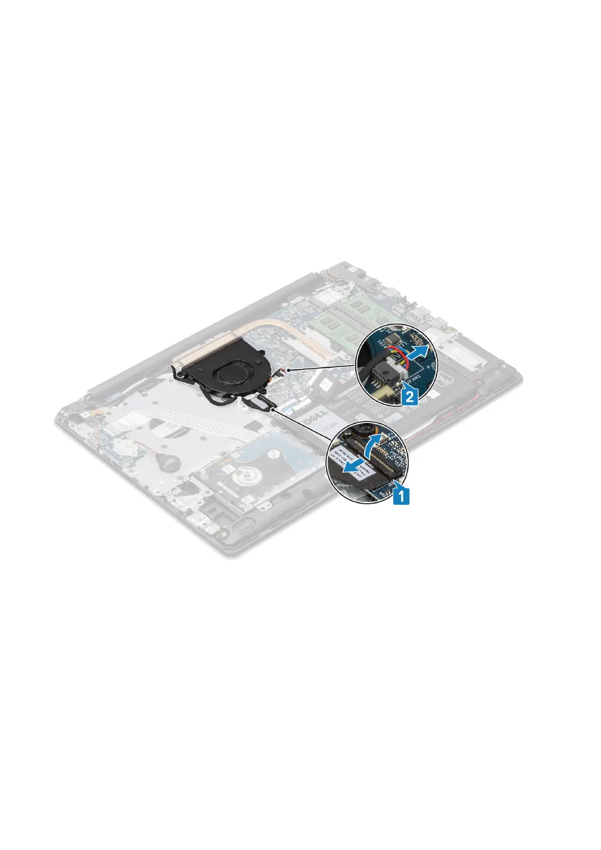 1. Disconnect the display cable and fan cable from the system board [1, 2].
