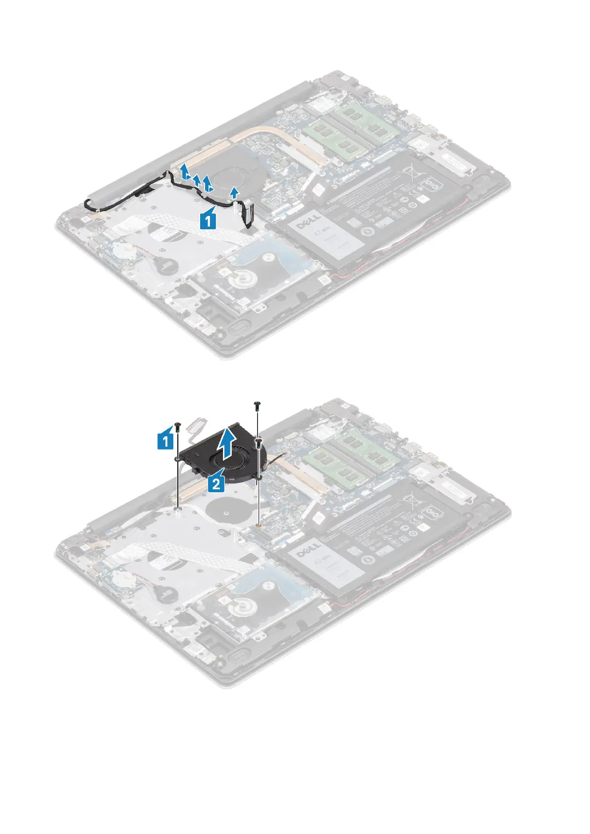 3. Remove the three (M2.5x5) screws that secure the fan to the palm rest and keyboard board assembly [1].