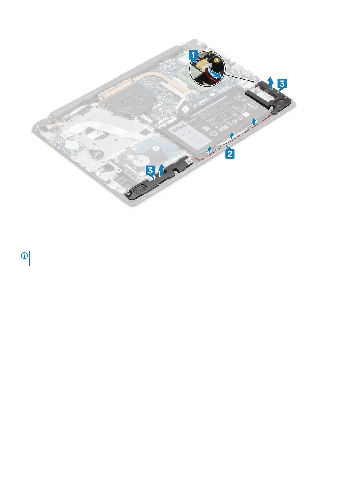 2. Route the speaker cable through the routing guides on the palm rest and keyboard assembly [2].