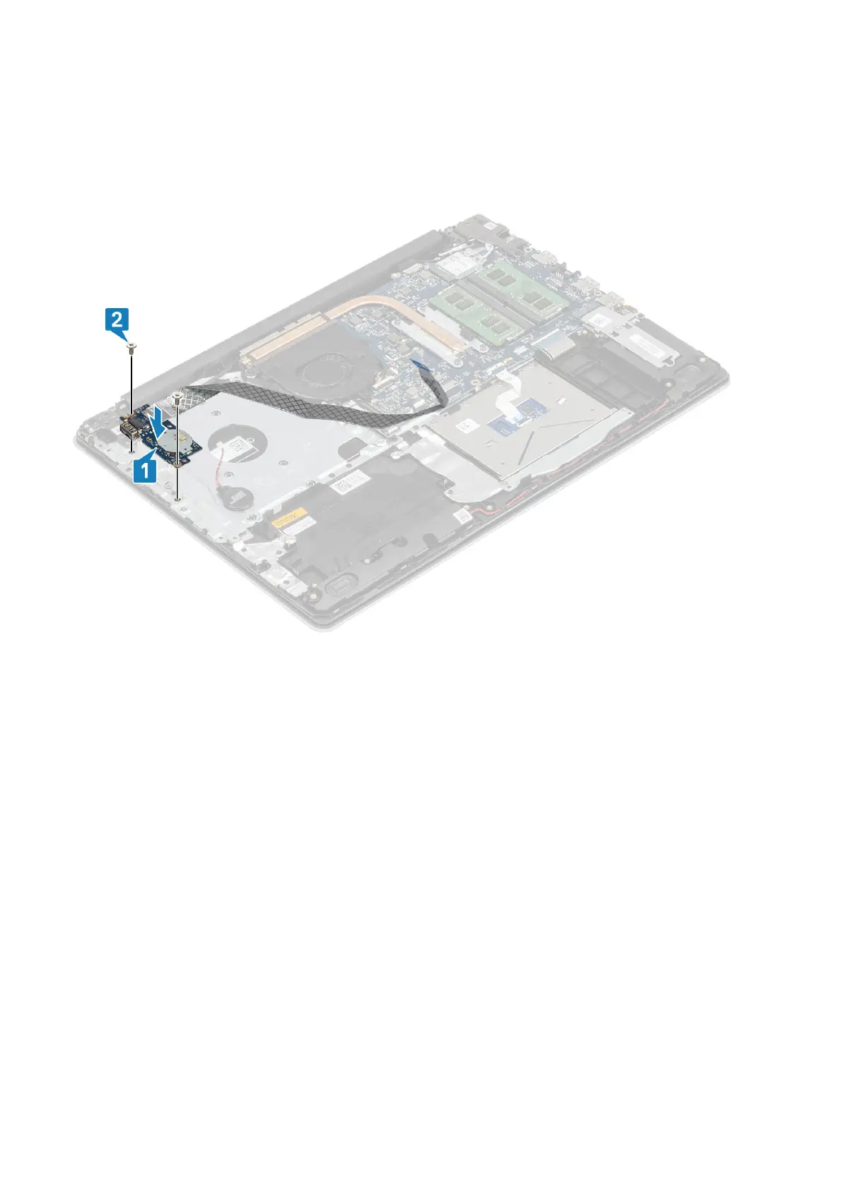 2. Replace the two (M2x4) screws that secure the I/O board to the palm rest and keyboard assembly [2].