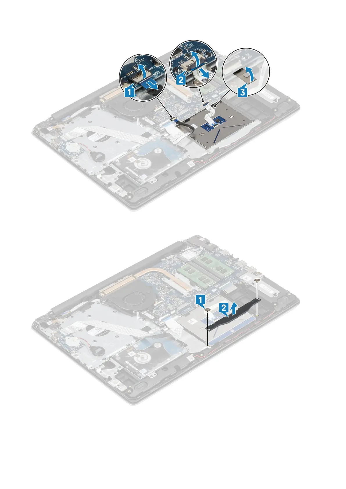 3. Remove the two (M2x2) screws that secure the touch pad bracket to the palmrest and keyboard assembly [1].