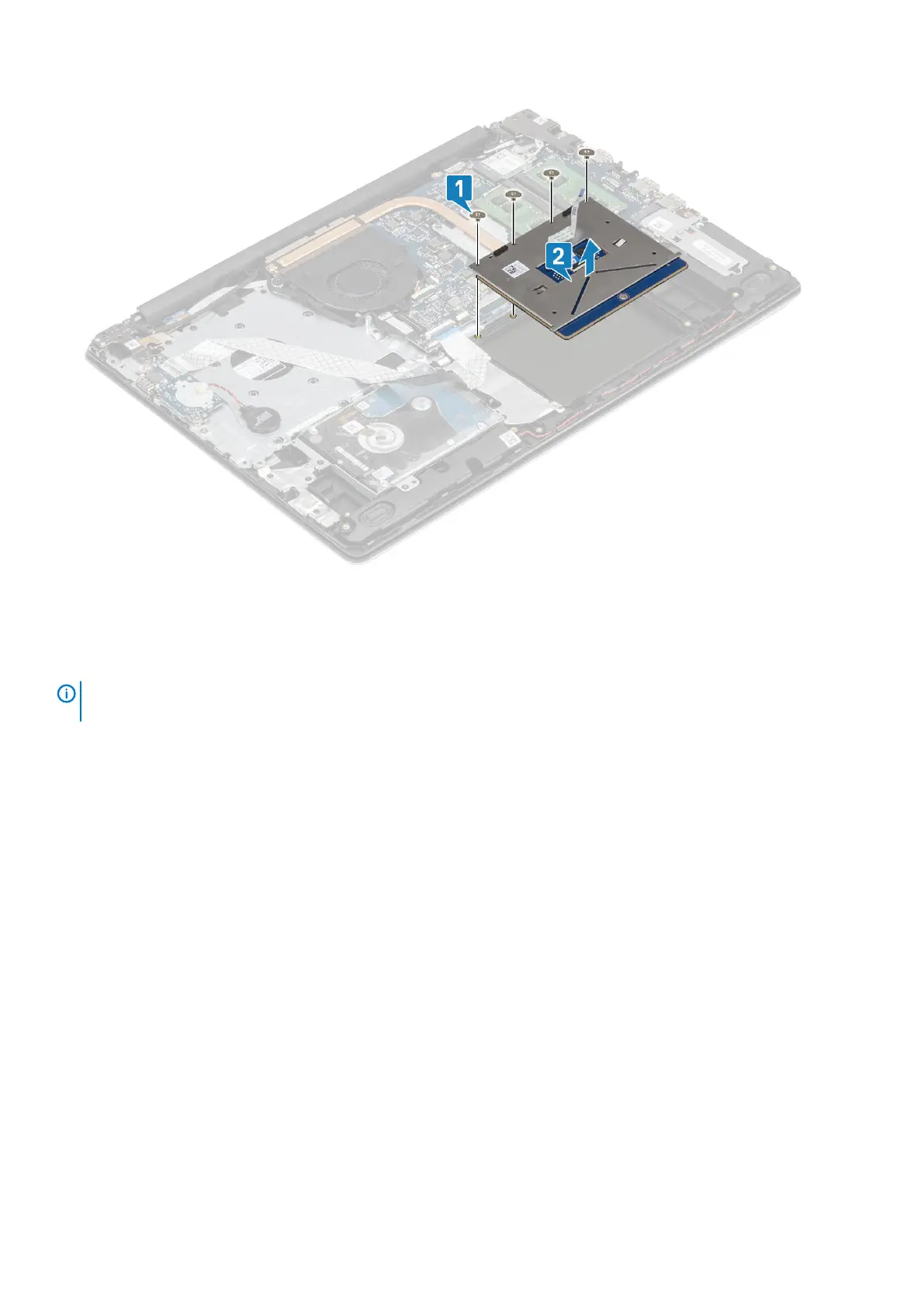 2. Replace the four (M2x2) screws that secure the touch pad to the palmrest and keyboard assembly [2].
