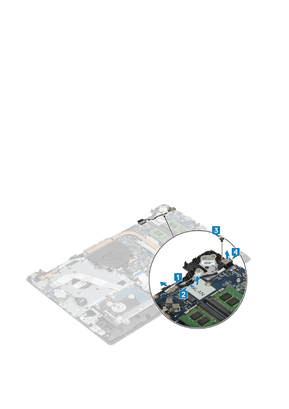 1. Disconnect and route the power adapter cable from the system board [1, 2].
