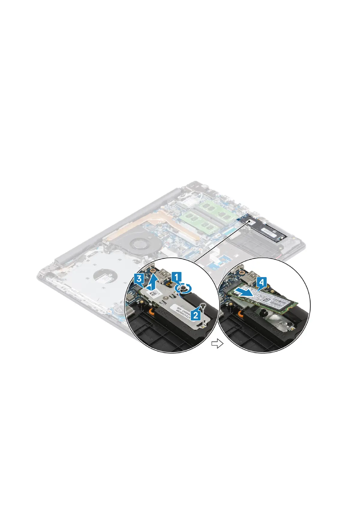 4. Slide and lift the solid-state drive/Intel Optane off the palmrest and keyboard assembly [4].