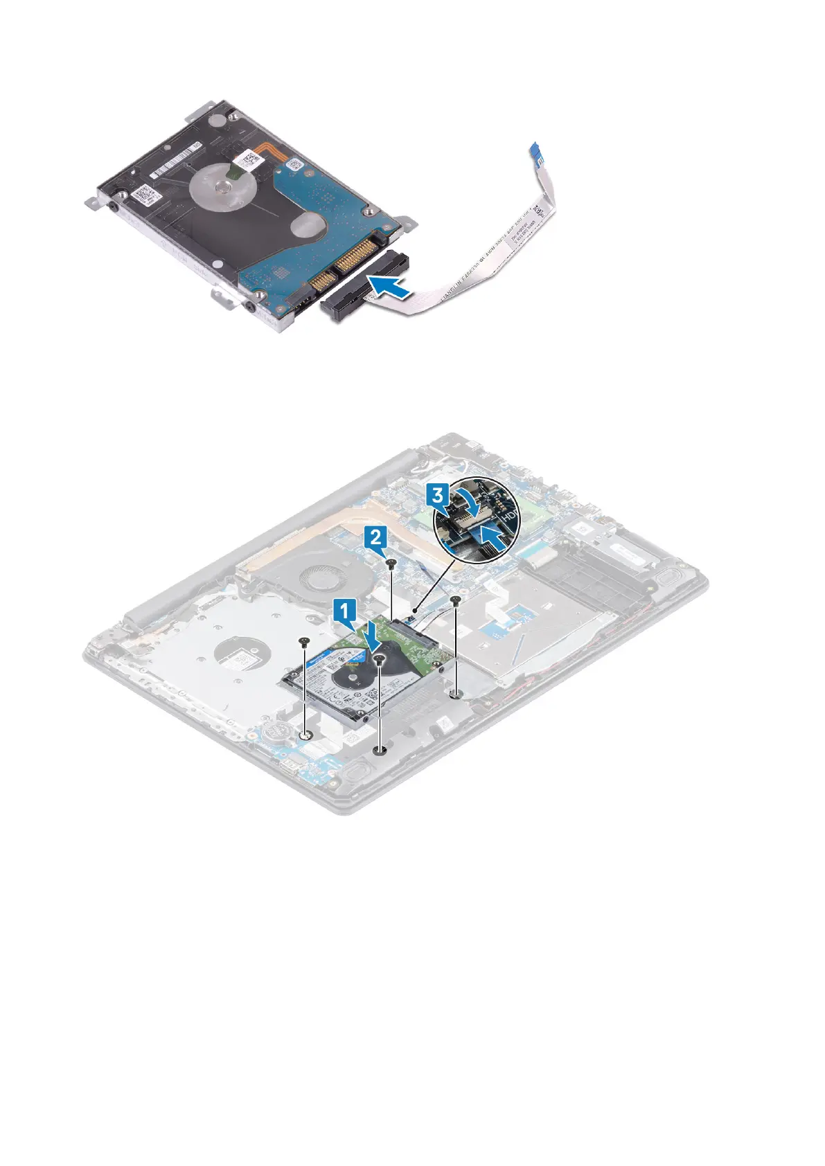 6. Connect the hard drive cable to the system board and close the latch to secure the cable [3].
