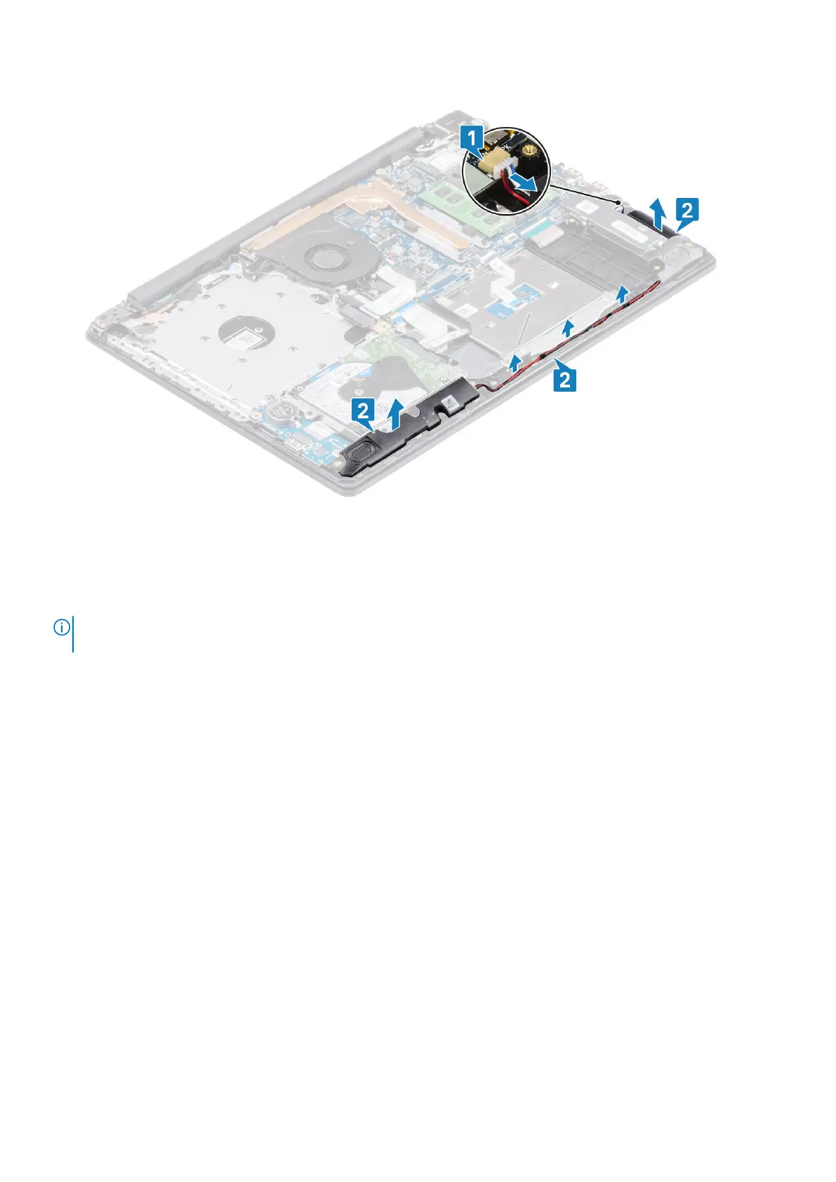 2. Route the speaker cable through the routing guides on the palm rest and keyboard assembly [2].