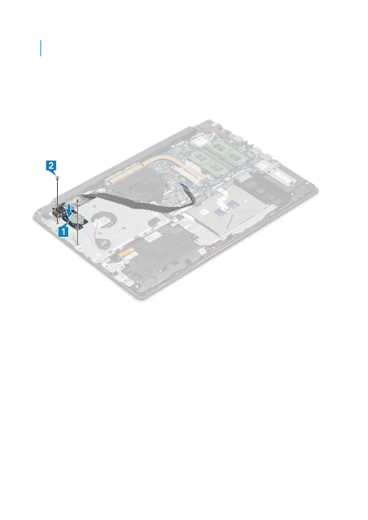 2. Replace the single (M2x4) screw that secures the I/O board to the palm rest and keyboard assembly [2].
