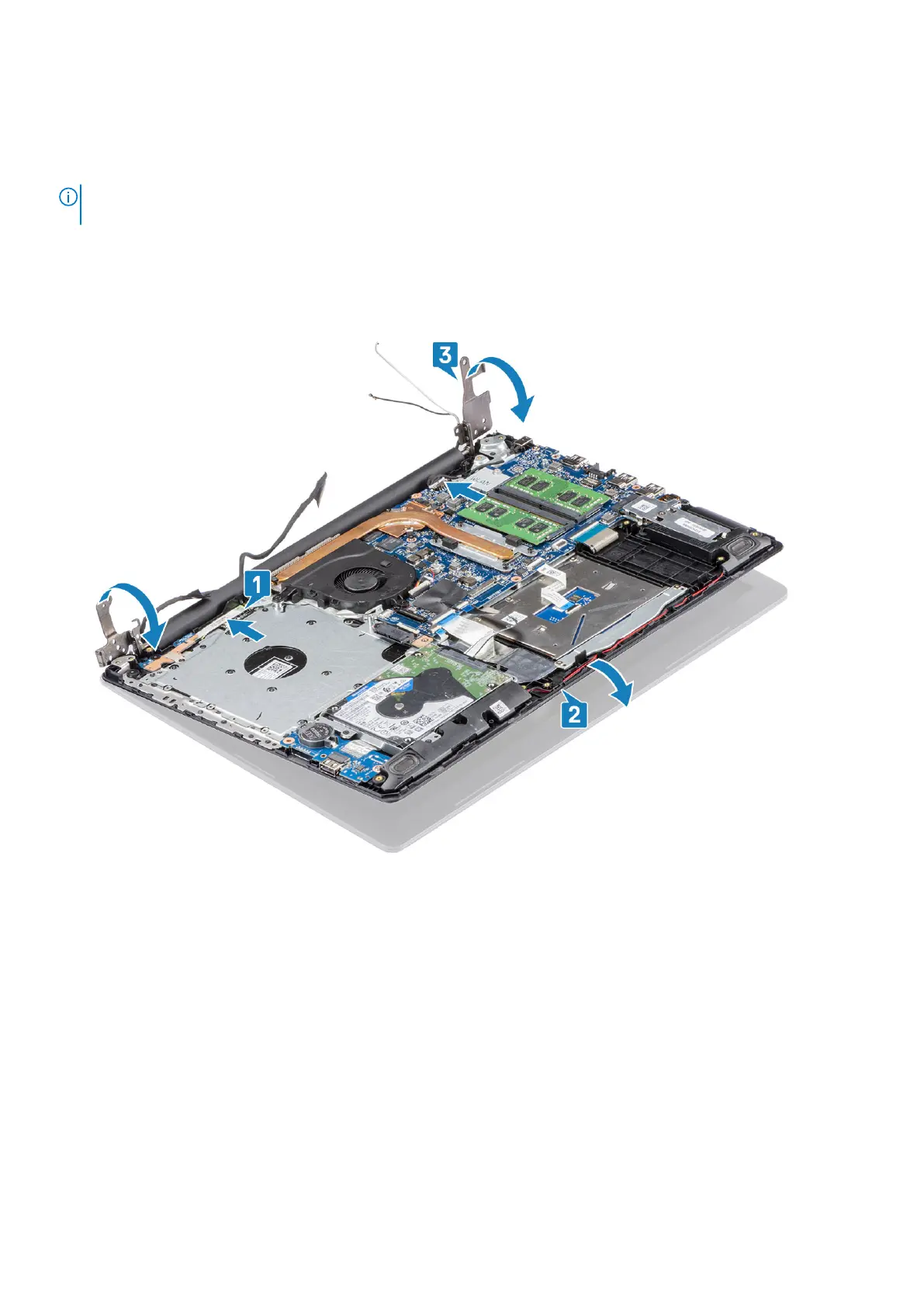 3. Press the hinges down on the system board, and palmrest and keyboard assembly [3].