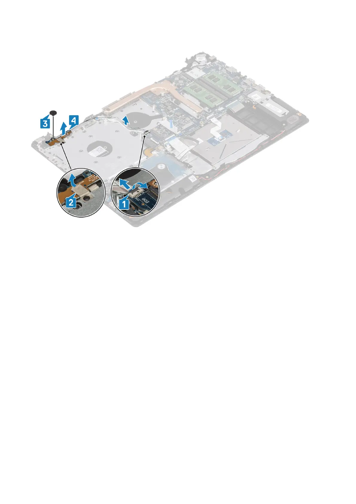4. Lift the power button board, along with the cable off the palmrest and keyboard assembly [4].