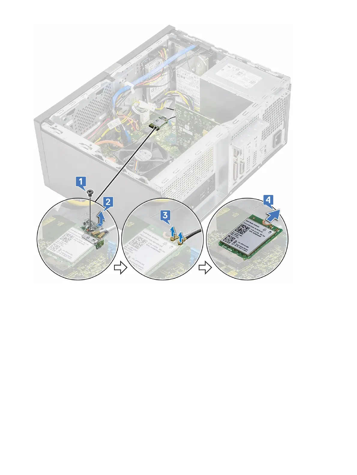3 Place the plastic tab on the WLAN card [3] and tighten one (M2x3.5) screw to secure the WLAN card to the system board [4].