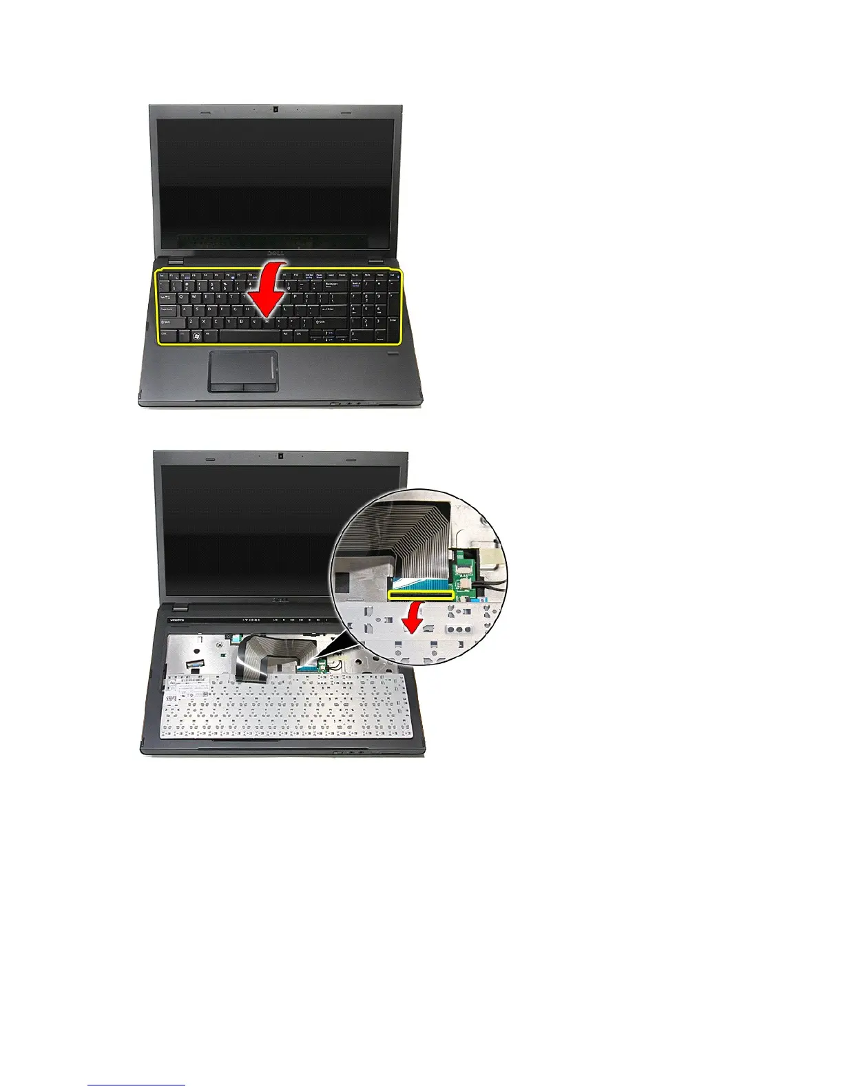 7. Disconnect the keyboard cable from its connector on the system board and remove the keyboard from the computer.