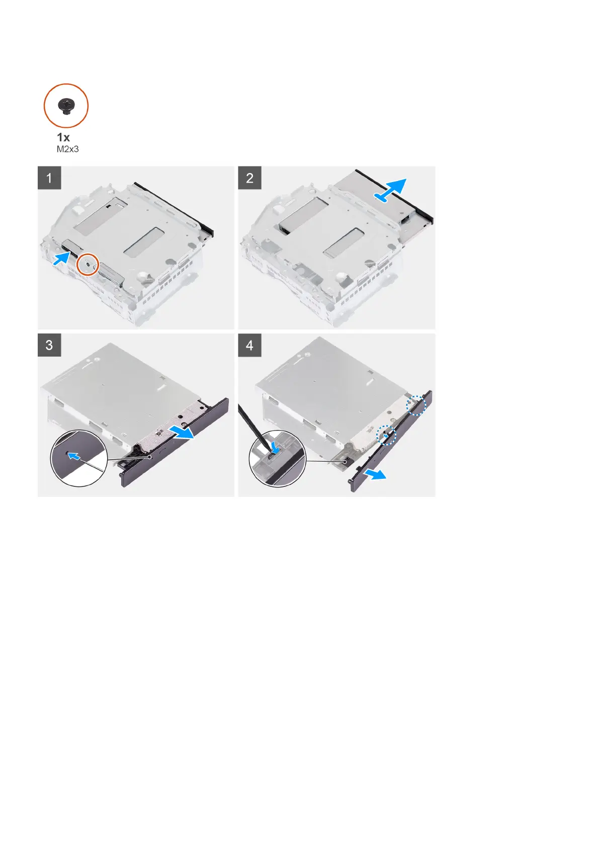 2. Remove the (M2x3) screw that secures the optical drive to the hard-drive and optical-drive bracket.
