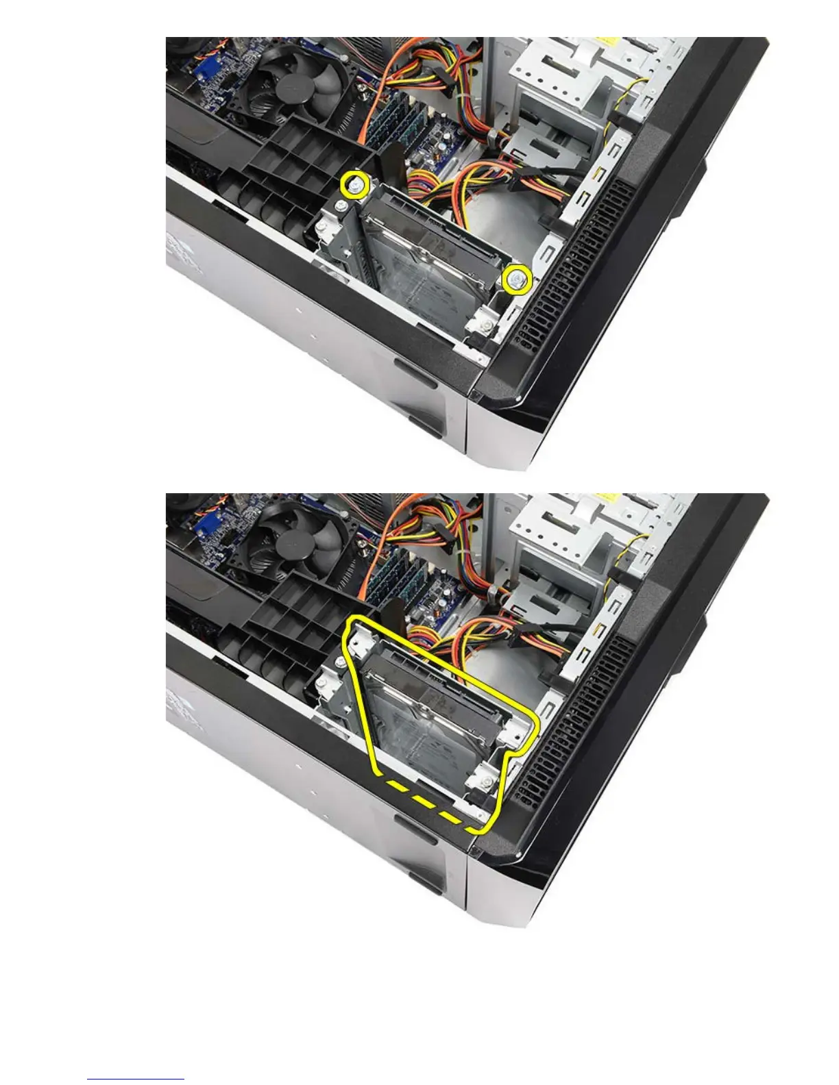 6. Remove the two screws securing the hard drive to the drive cage.