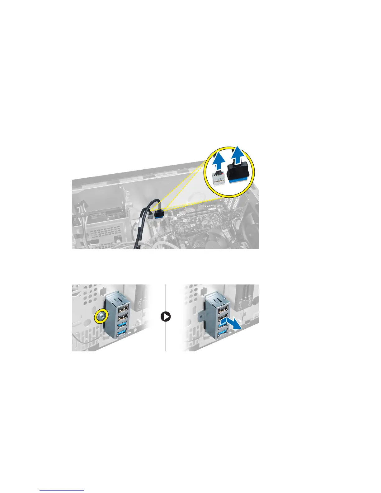 4. Disconnect the front USB module data cable and the power cable from the system board.